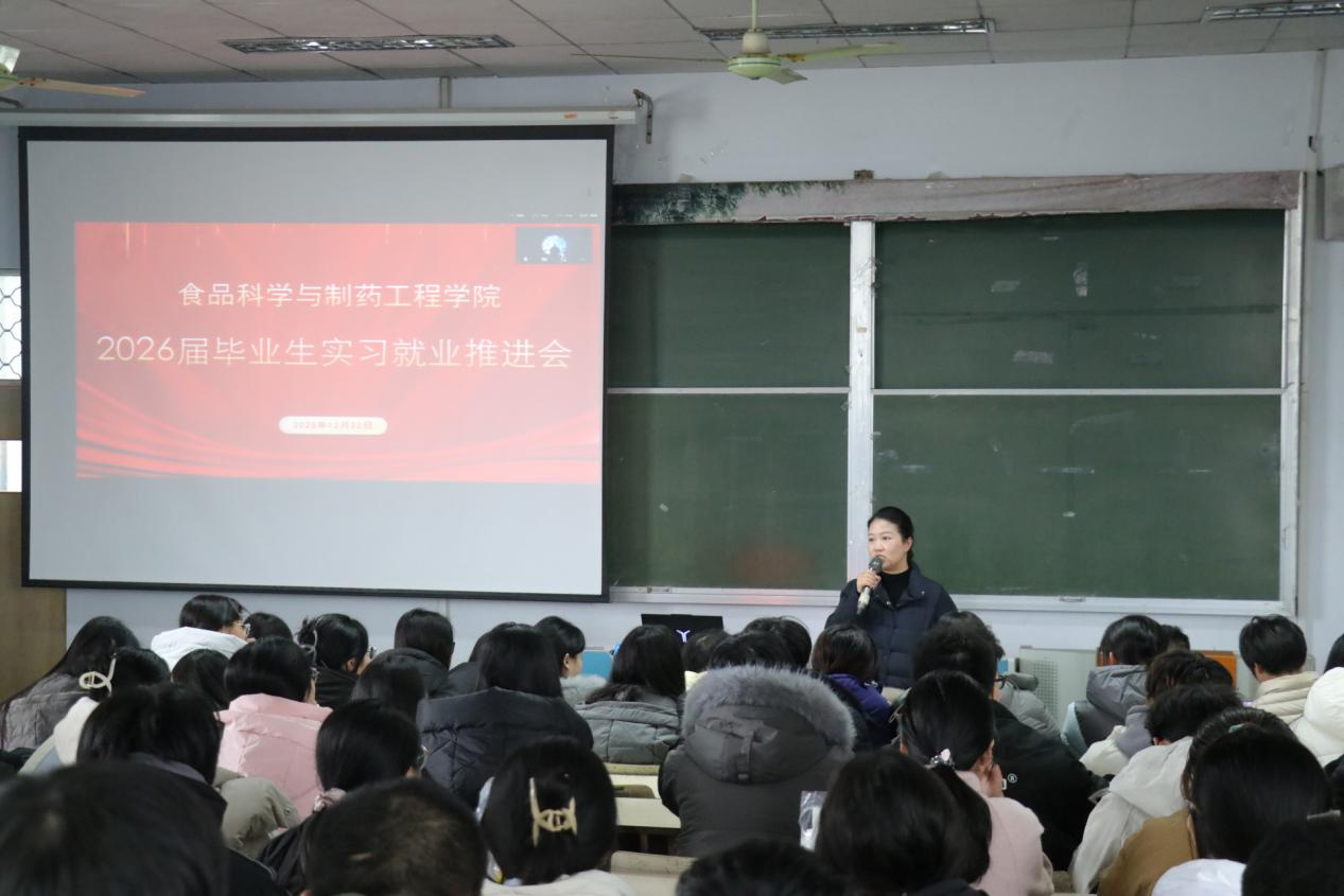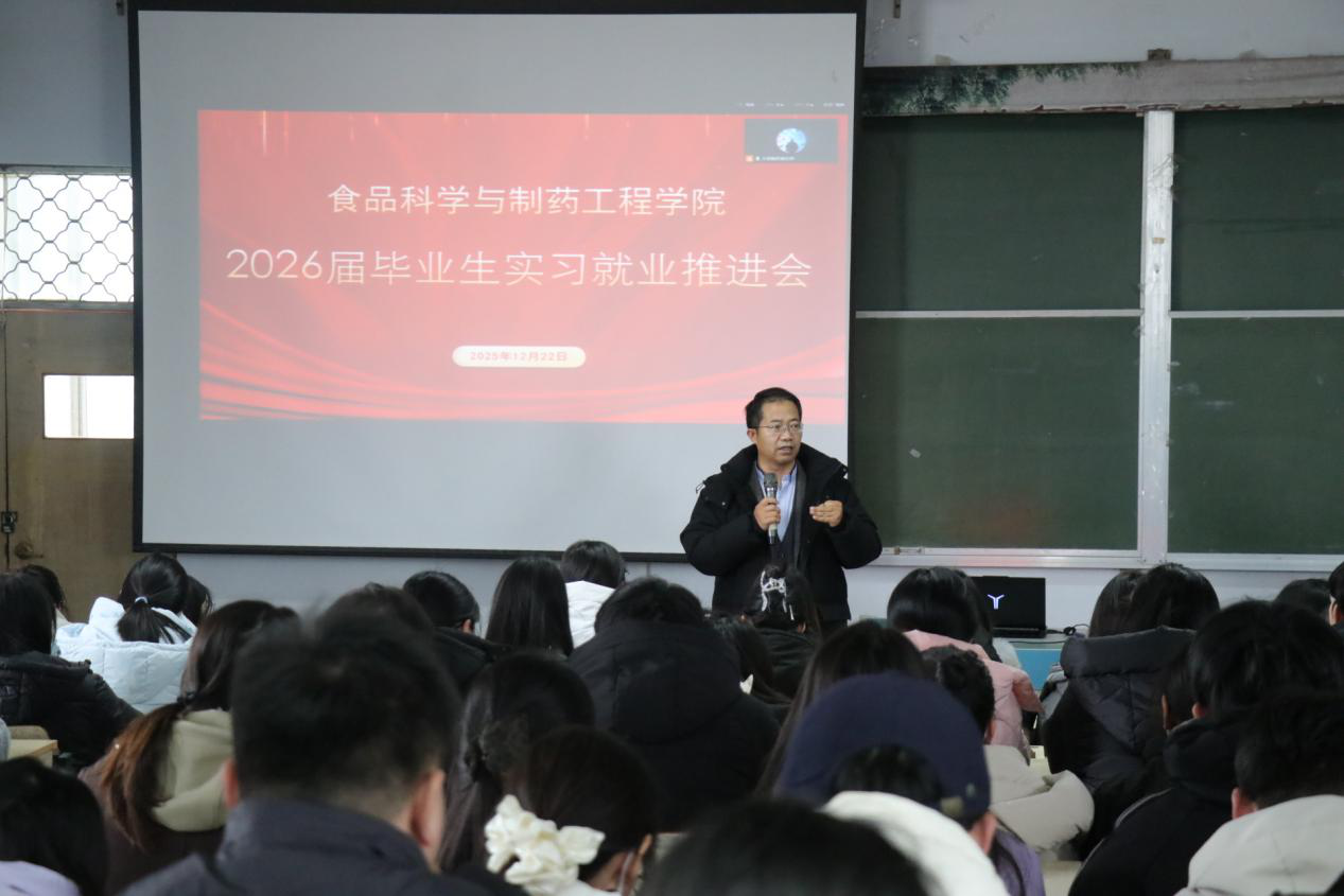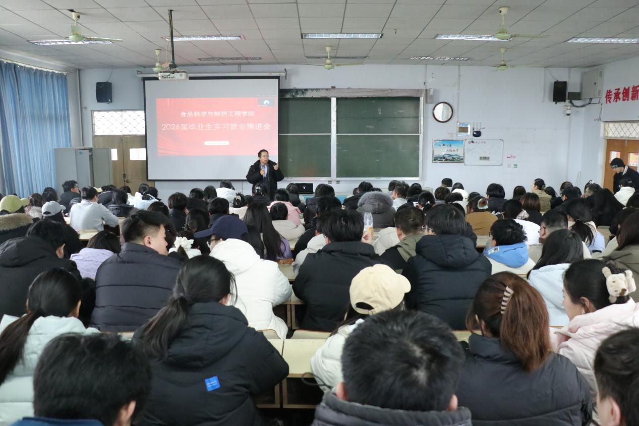 随后,孙中贯就2026届毕业生实习工作作出具体安排。他详细解读了实习管理规定、安全注意事项、实习报告撰写要求等核心内容,明确了实习时间节点与考核标准。针对不同专业方向,他介绍了学院合作的多家优质实习单位资源,包括知名食品加工企业、制药研发机构等,并强调要严格遵守实习单位规章制度,确保实习过程安全有序、学有所获。