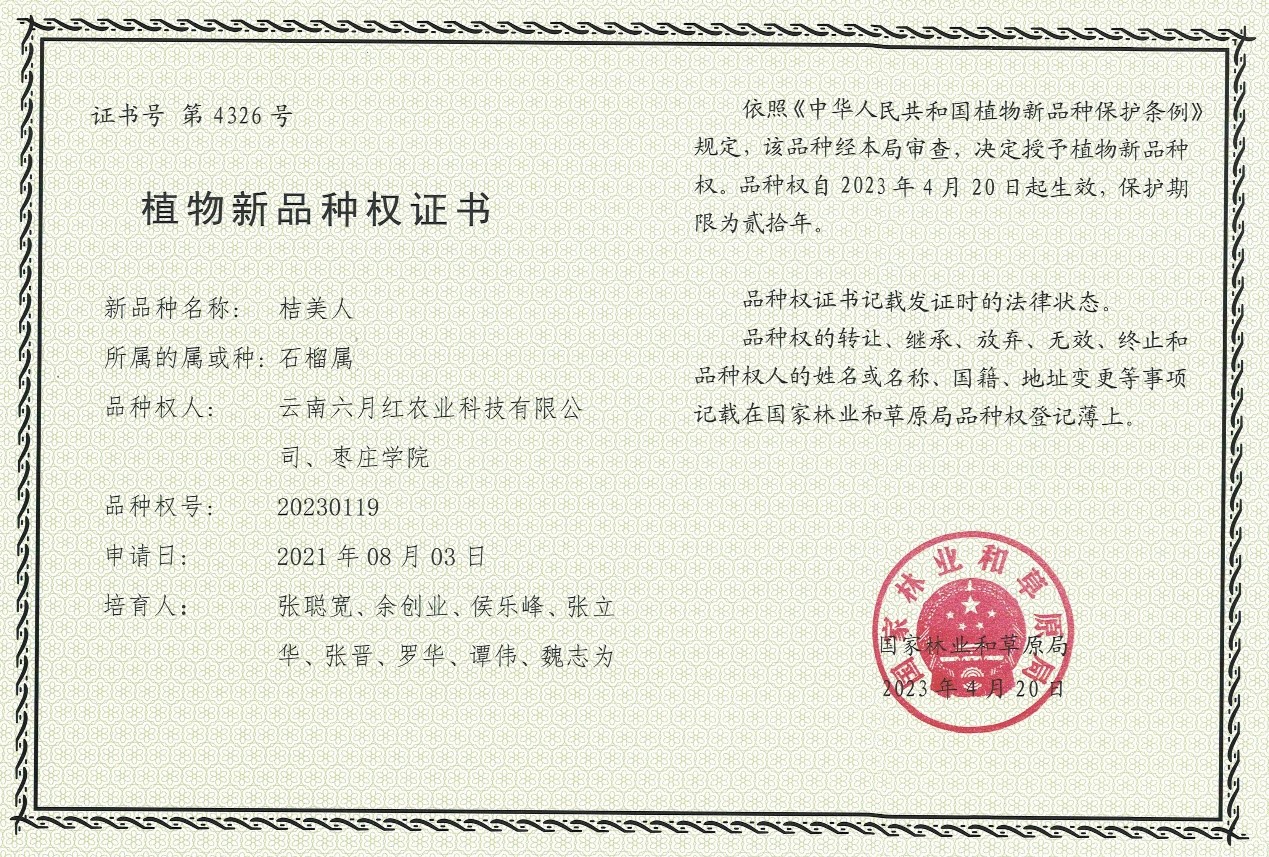 我校永利23411集团“石榴+植物资源科研团队”,利用山东省石榴精深加工工程技术研究中心和山东省石榴资源综合开发工程实验室的科研平台优势,与省内外科研院所、企业等开展广泛的技术合作。近日,该团队联合云南六月红农业科技有限公司申报的一个石榴植物新品种‘桔美人’,获得国家林业草原局的授权。该品种是由‘红如意’与‘Wonderful’杂交培育而成。具有早熟、丰产、稳产、果个大、果皮浓红、籽粒紫红、抗病、抗裂果、可溶性固形物含量高、挂树时间长(30天)等优良特性,籽粒风味甜、微酸,更适合中国大众消费口味。果实近球形,果皮桔红色。大型果,平均单果质量452g;籽粒紫红色,百粒质量44.6g;籽粒硬度2.12kg/cm2;平均可溶性固形物含量15.9%,总糖含量15.20%,总酸含量3.04g/kg,糖酸比50.0,风味酸甜;综合品质优良。‘桔美人’丰富了我国石榴品种,在一定程度上可促进石榴产业的发展。