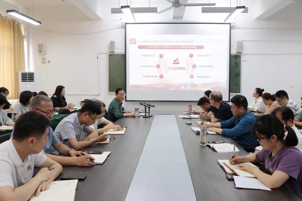 滕聿峰指出,学院全体党员、干部和师生要牢牢把握主题教育“学思想、强党性、重实践、建新功”的总要求,坚持学思用贯通、知信行统一。从习近平新时代中国特色社会主义思想中汲取奋发进取的智慧和力量,不断增强学习和践行习近平新时代中国特色社会主义思想的政治自觉、思想自觉和行动自觉,勇做“捍卫两个确立”“增强四个意识”“坚定四个自信”“做到两个维护”的模范和表率。要把主题教育与推动学院重点工作紧密结合,坚持以党建为引领,聚焦高层次人才力量整合、人才培养、硕士点培育、专业认证、服务地方等工作,解放思想,统筹谋划、积极作为,真正将主题教育的成果转化为推动学院高质量发展的强大动力,以主题教育成果赋能学院工作高质量发展。