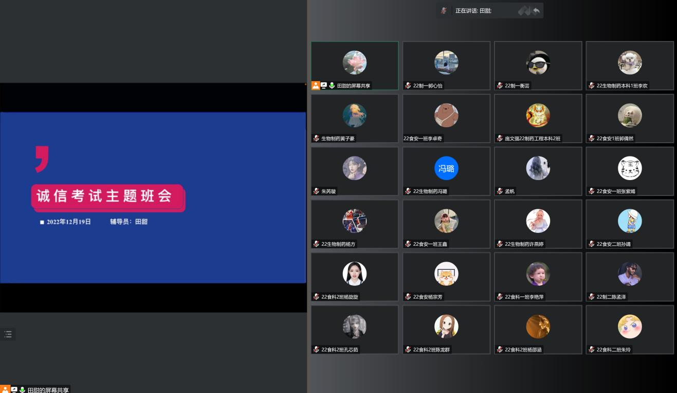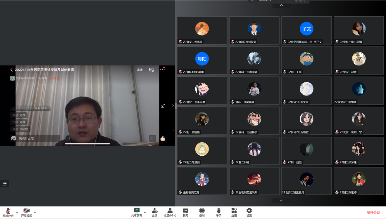 为进一步加强学生考风考纪教育,营造诚信应考的良好氛围,永利23411集团于12月19日晚召开了期末线上考试培训暨考风考纪教育会议。本次会议采取腾讯会议线上进行,由学院副院长王京龙主讲,各年级辅导员、班主任、2020-2022级全体学生参加。