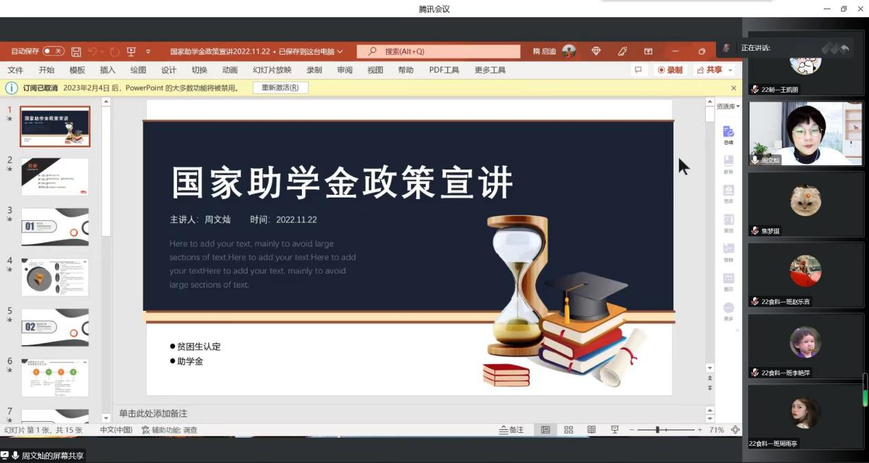为全面推进资助育人,增强资助政策的宣传力度,增进学生对资助政策的了解和认识,永利23411集团于11月22日在线上举办国家助学金政策宣讲会。本次会议由学院辅导员周文灿老师担任主讲,2022级全体学生参加。