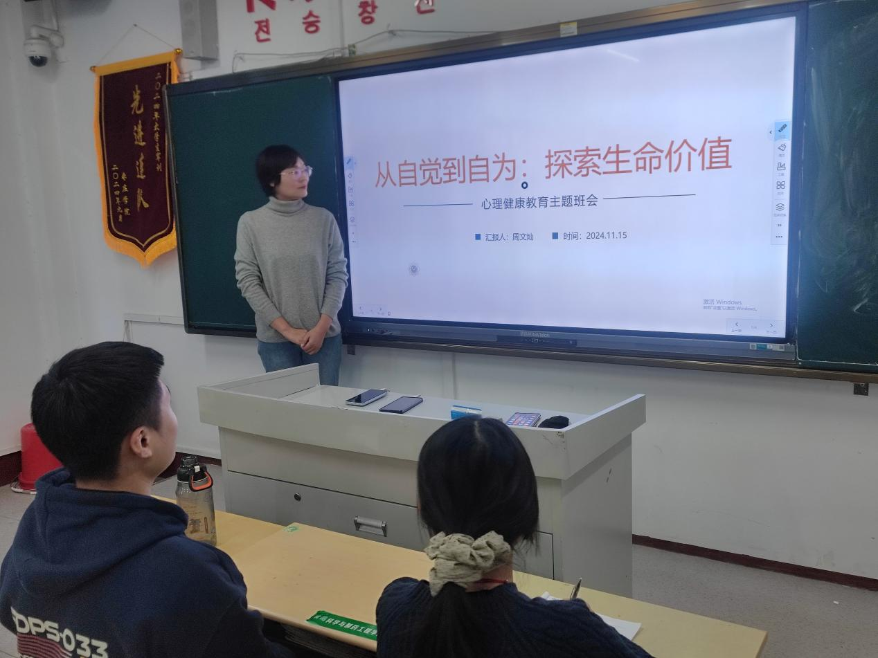 为帮助大一新生更好地适应大学生活,树立正确的生命观和价值观,11月15日晚,永利23411集团在文科楼216教室召开“从自觉到自为:探索生命价值”为主题的心理健康教育班会,班会由学院心理辅导员老师主讲,2024级新生参加。