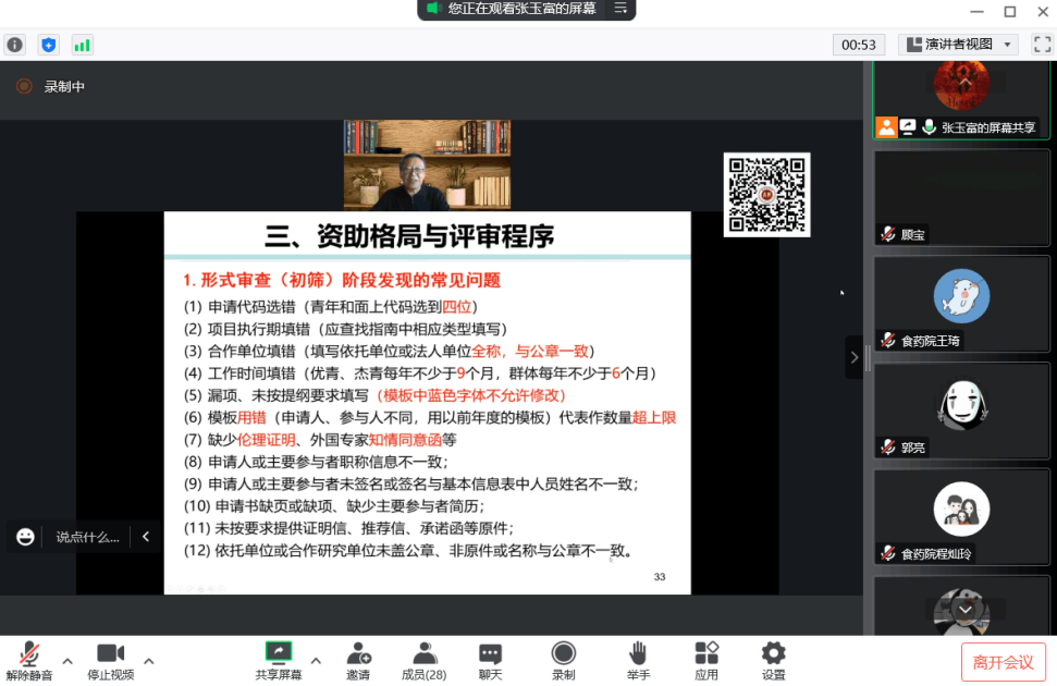 会议通过线上方式举行。徐长庆教授和胡长文教授从国家自科基金资助定位、基金委新时期改革方略、资助格局与评审程序、获批项目汇总与启示、资助体系与评审程序、同行专家关注的问题、如何撰写高质量申请书、撰写基金申请书技巧等七个方面,从评审专家和申请人两个角度,展开报告。两位教授还结合自己的研究方向、研究内容以及研究经历对凝练科学问题和基金撰写的主要问题进行了具体分析和指导。