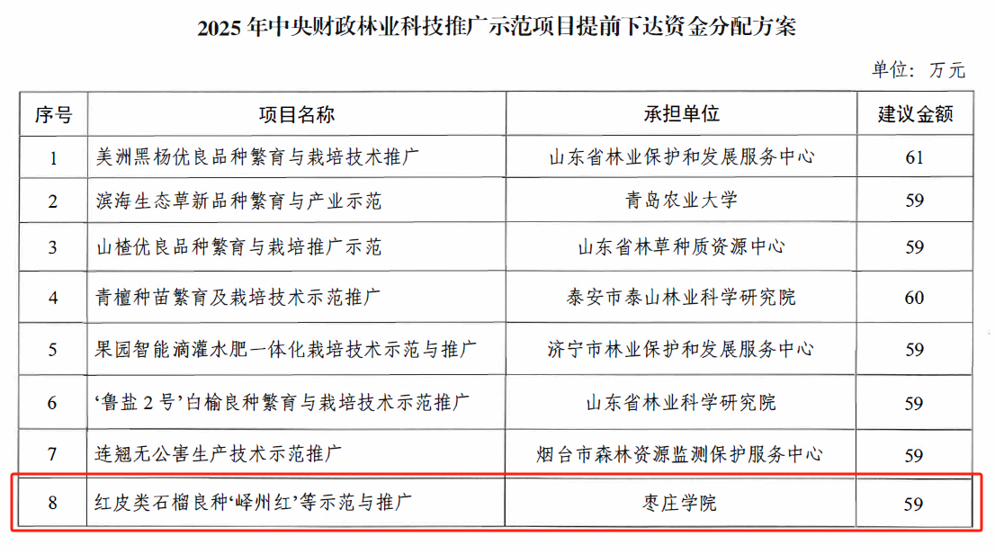 近日,山东省自然资源厅公布了2025年中央财政林业科技推广示范项目立项情况,由我校牵头申报的红皮类石榴良种“峄州红”等示范与推广项目成功获批立项。我院鹿颜博士为项目负责人,获批科研总经费80万元,2025年安排预算资金59万元。