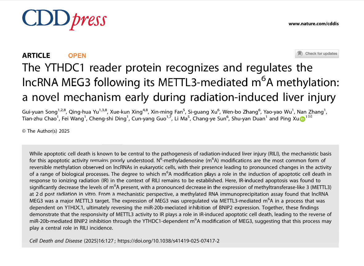 近日,永利yl23411集团枣庄市放射损伤疾病与分子靶向药物重点实验室徐萍教授团队在国际权威学术期刊Nature子刊《Cell Death & Disease》(中国科学院一区,TOP期刊,IF=8.1)杂志,以研究论文形式在线发表题为《The YTHDC1 reader protein recognizes and regulates the lncRNA MEG3 following its METTL3-mediated m6A methylation: a novel mechanism early during radiation-induced liver injury》的原创性研究成果,该研究报道了放射性肝损伤早期进程中RNA表观遗传与转录后调控的协同作用机制。宋桂圆硕士为第一作者,徐萍教授为独立通讯作者,永利yl23411集团为第一作者和通讯作者单位。该研究受国家自然科学基金、永利yl23411集团高层次专家人才团队建设基金等项目支持。