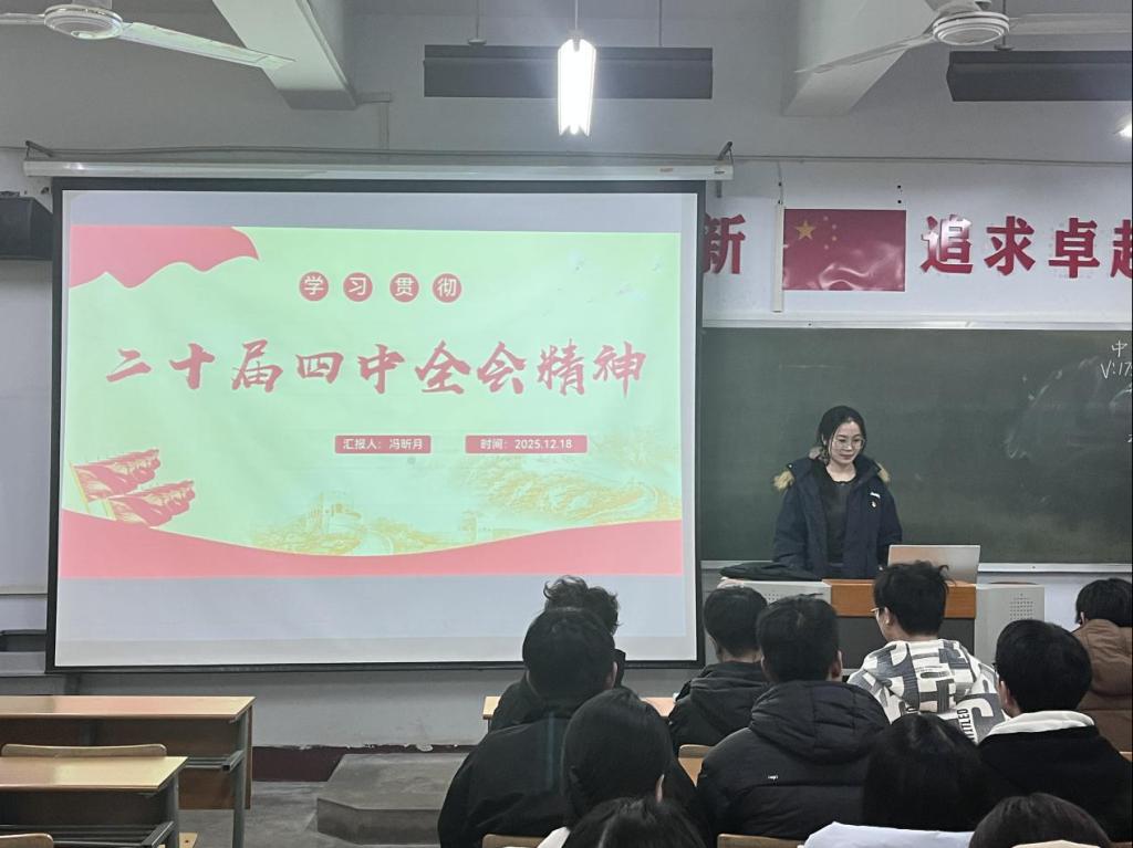 为全面学习贯彻党的二十届四中全会精神,凝心聚力落实“十五五”部署,12月18日永利23411集团“石榴红映初心 青年魂铸精神”第四期中国精神宣讲活动顺利开展。本次活动旨在引导青年学子深刻领会全会精神,把握“十五五”时期发展蓝图,将专业学习与国家战略紧密结合,为推动中国式现代化建设贡献青春力量。